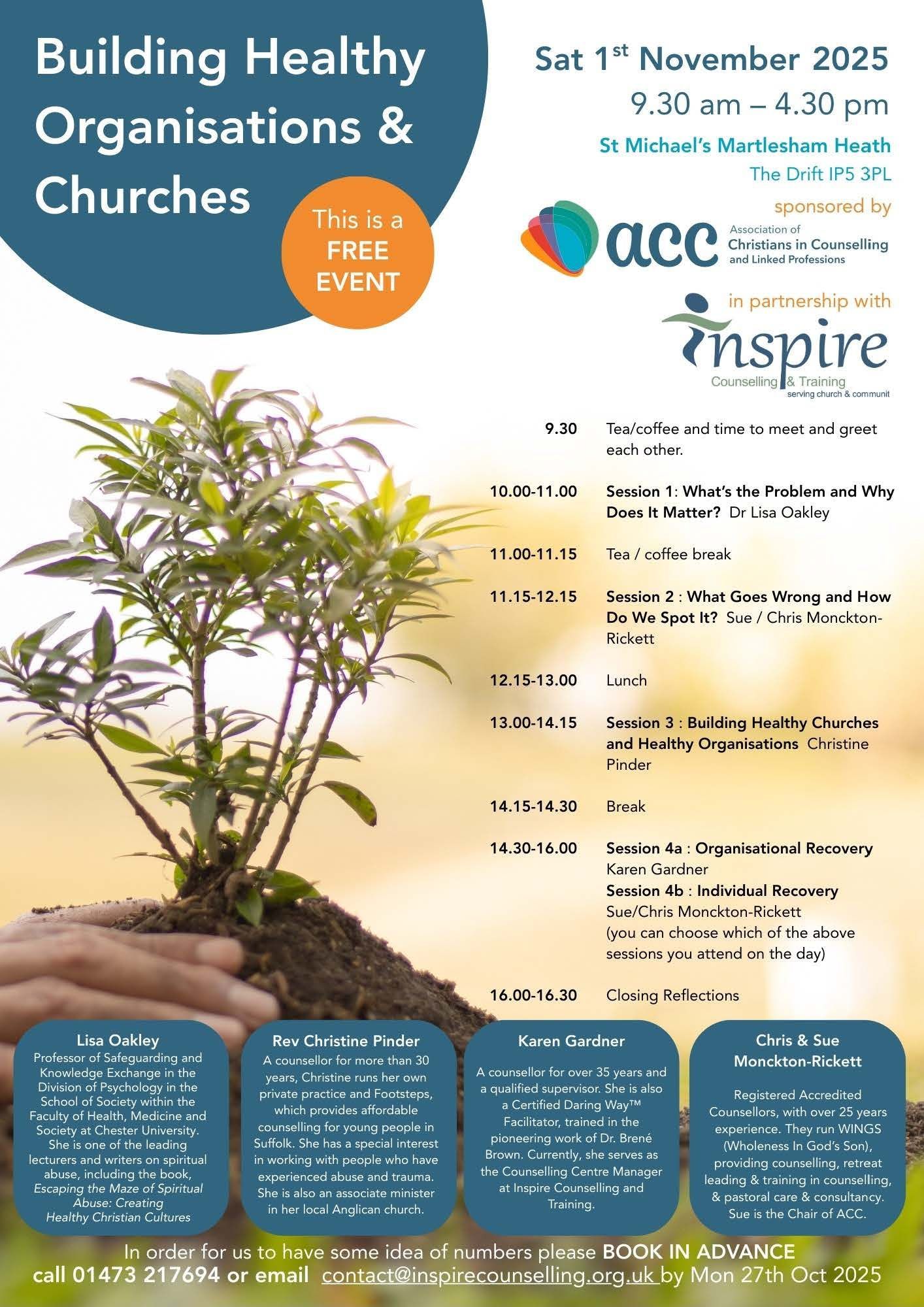 ACC and Inspire have therefore come together to provide an event to look at this multi-layered issue. Proactively, looking at how we build more healthy churches and organisations, with the hope that this may help to prevent problems for the future. Also, looking at how we can support people who have been through distressing experiences and how churches and organisations can healthily recover and rebuild after such issues.